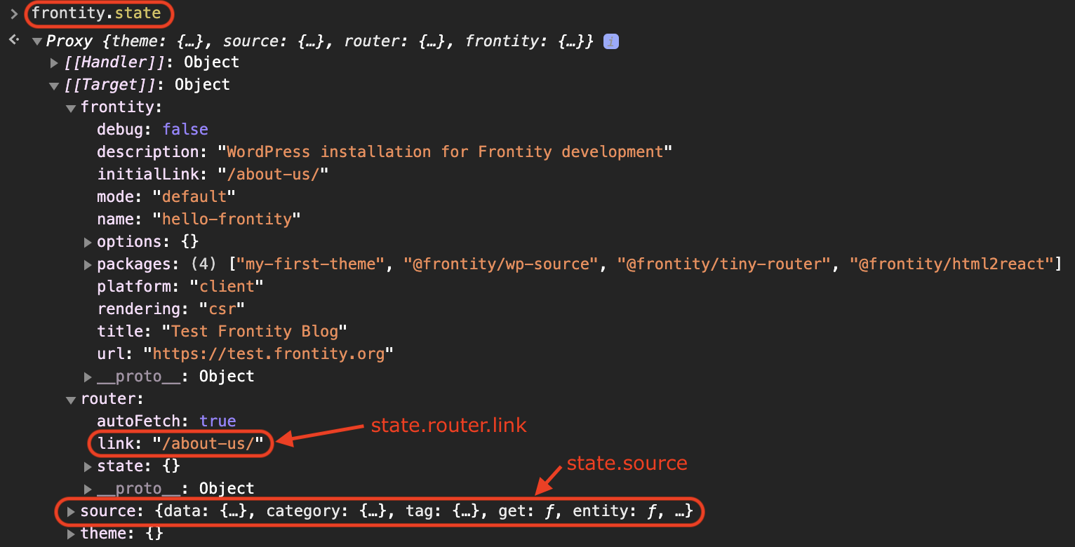 You can see information about the router, including the state.router.link that we used earlier, which as we now know stores the current URL. You can also see data contained in state.source, this is the data fetched by @frontity/wp-source which is the package that connects Frontity to your WordPress site.