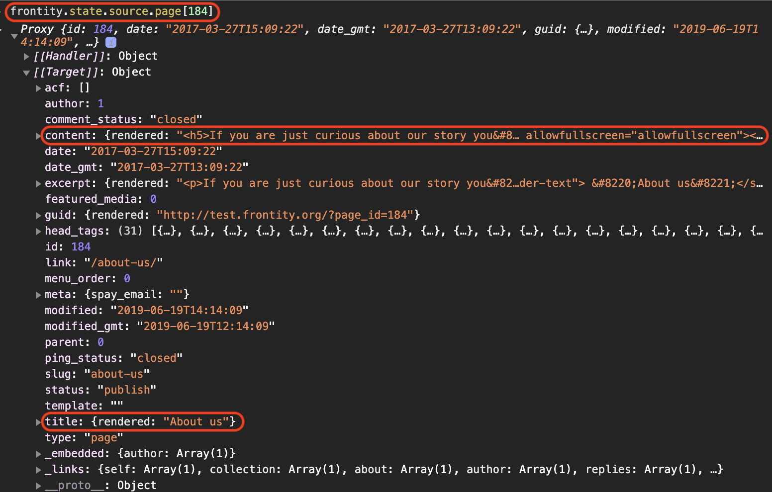 With the information from the first step that the URL /about-us/ is a page and has the ID 184, we can take the second step and access the data of that page with frontity.state.source.page[184]:
