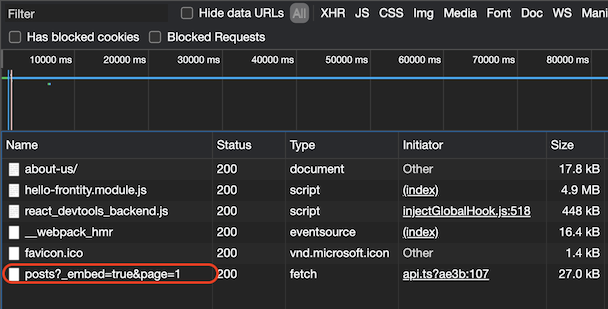 If we open the Network tab (in the browser's devtools) and click on the menu to go to 'Home', we can see that a call to the REST API is made to get the latest posts.