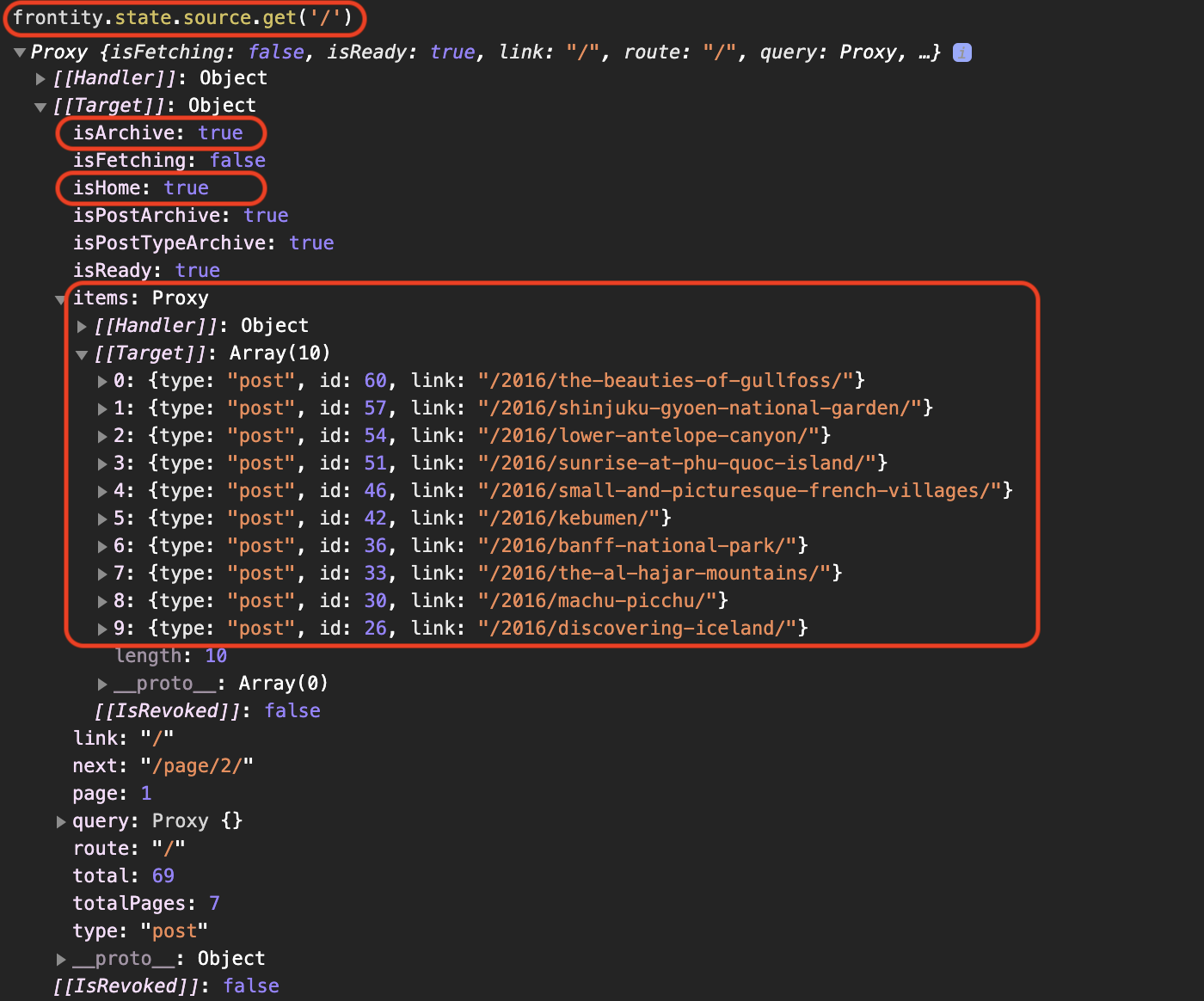 So now let’s inspect the information about the homepage using frontity.state.source.get('/'):