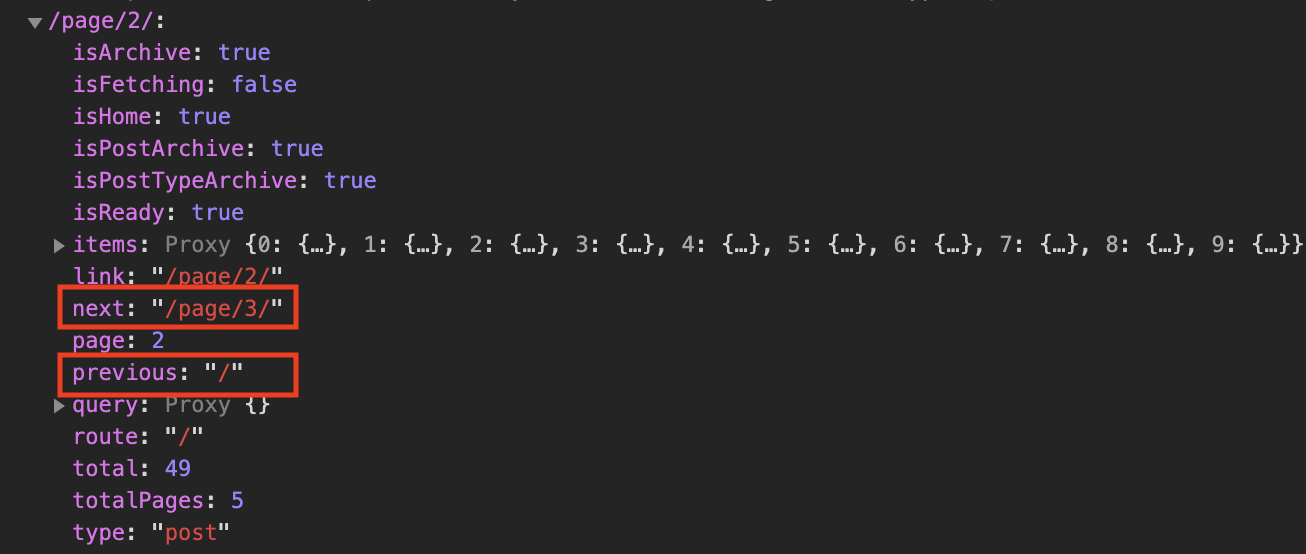 Click on the More posts link in the menu to navigate to /page/2 and examine frontity.state in the console. You will notice that the data for the page has both previous and next properties.